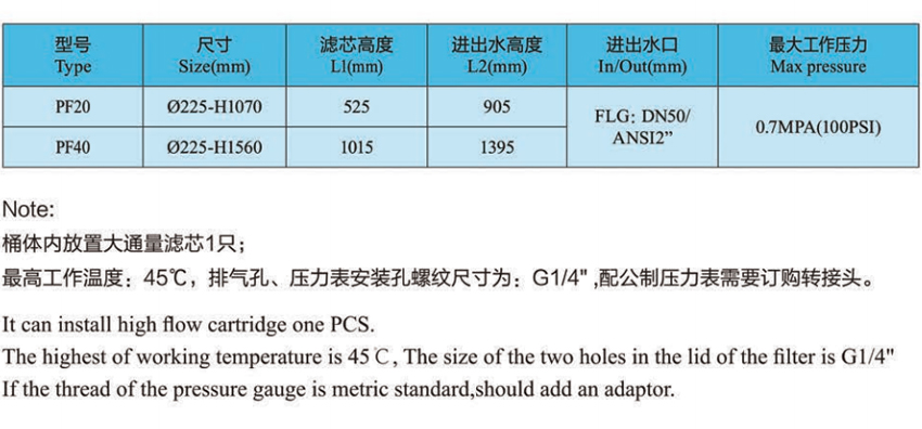 PF filter system can be widely used sewage and wastewater reuse, desalination, electronics and other fields. It is character with high flow, long working life and good operation of complex liquid. It consists of the housing and the cartridge.